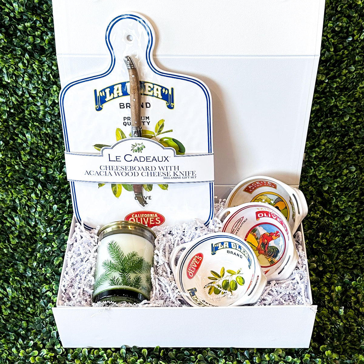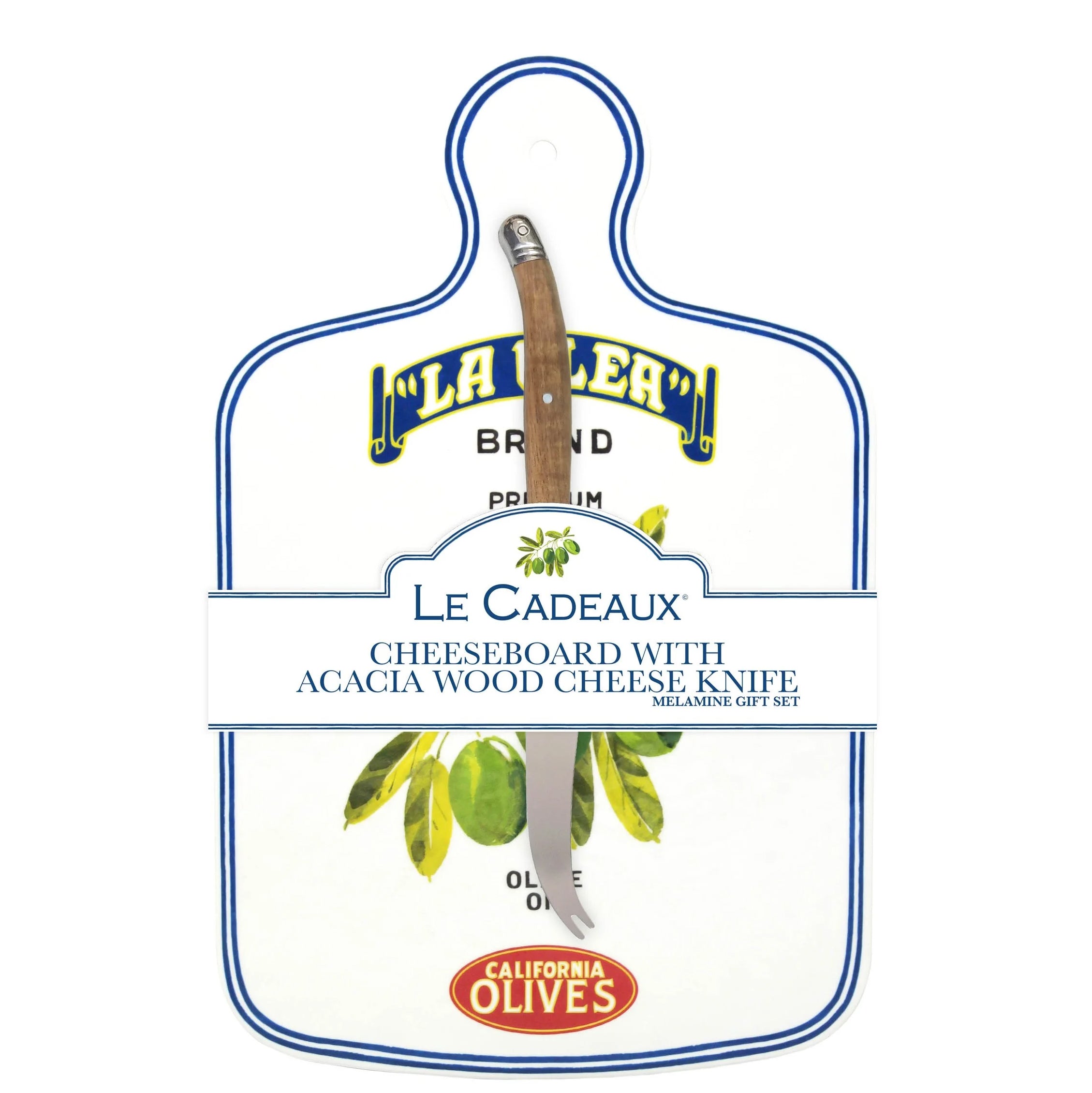 - Vintage Olive Design Melamine Cheeseboard with Laguiole Cheese Knife, with its packaged look makes the perfect gift. BPA Free 100% melamine, shatter-resistant and dishwasher safe, top and bottom rack. As with all melamine, not recommended for microwave. Cheeseboard dimensions are 13.5” by 8.5”.