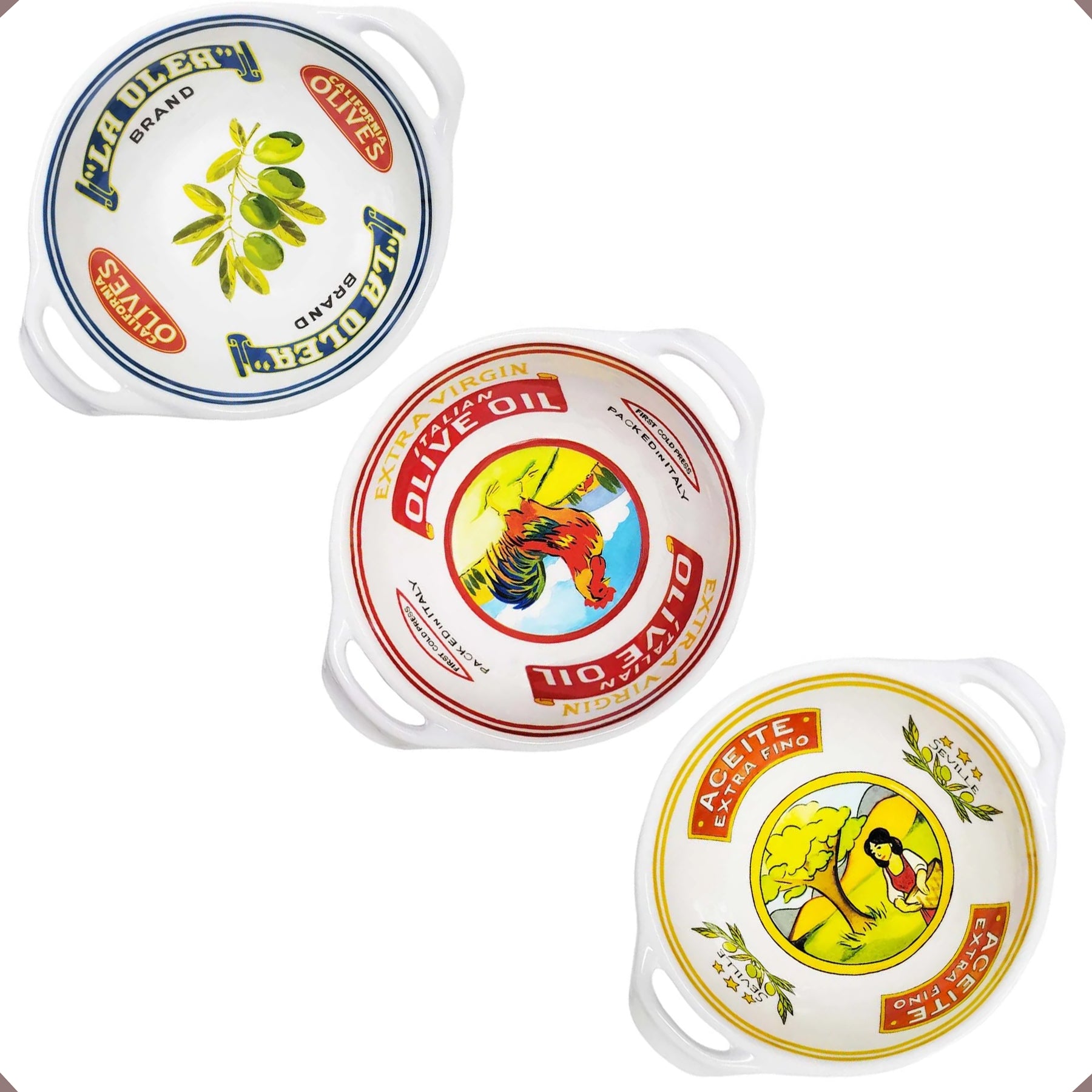 - Set of 3 Melamine Bowls with Vintage Designs. These handled bowls are Inspired by the traditional artwork found on olive oil bottles and cans in the growing regions of Italy and California. BPA Free 100% melamine, shatter-resistant and dishwasher safe, top and bottom rack. As with all melamine, not recommended for microwave.