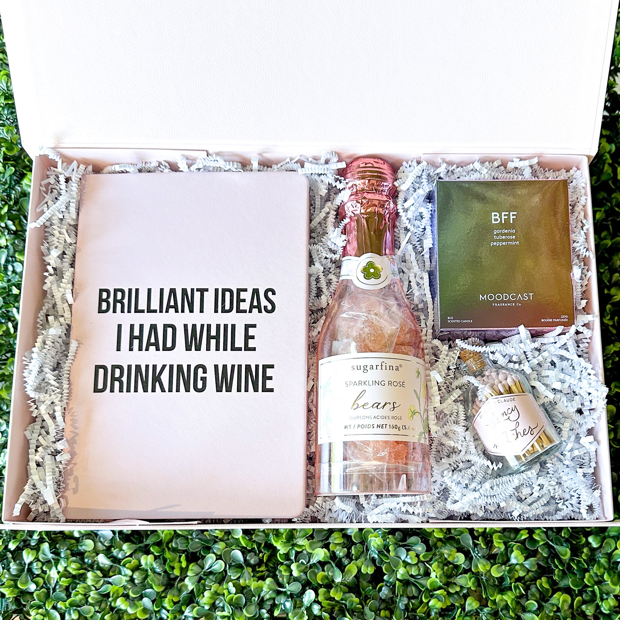 - Blank, lined journal with a pink cover that reads "BRILLIANT IDEAS I HAD WHILE DRINKING WINE"