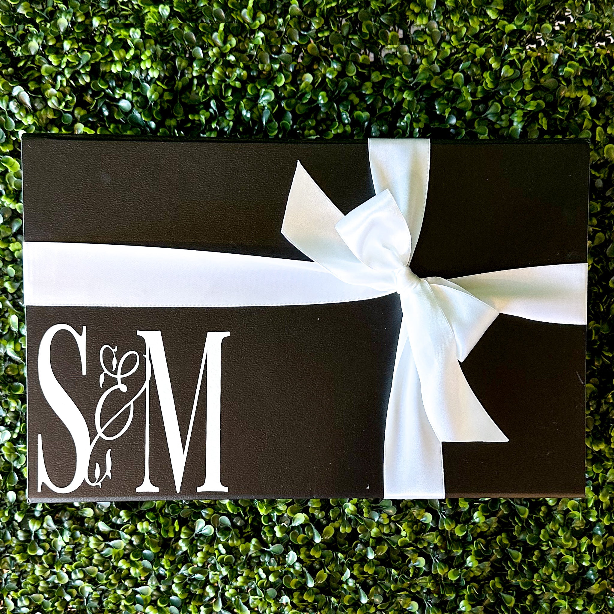 Shown in a black box with white personalized name or initials. Box measures 14" x 9" x 4.3" with a magnetic closure, tied with luxurious satin ribbon, and includes a gift note.