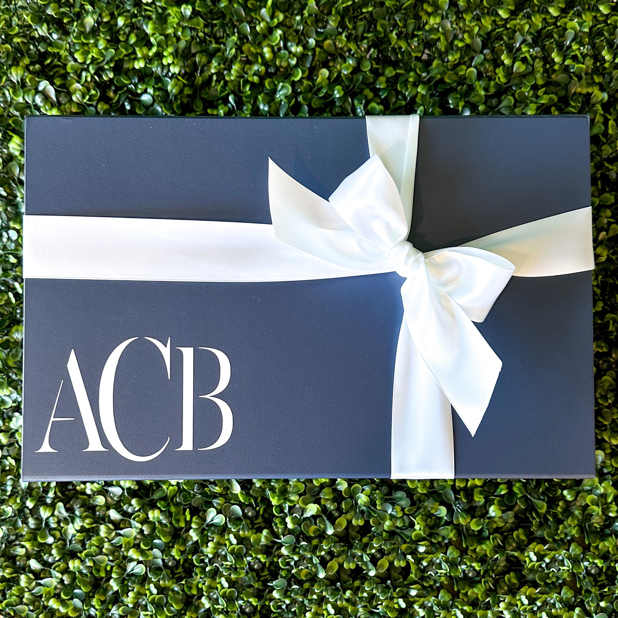 Shown in a navy blue box with white personalized name or initials. Box measures 14" x 9" x 4.3" with a magnetic closure, tied with luxurious satin ribbon, and includes a gift note.