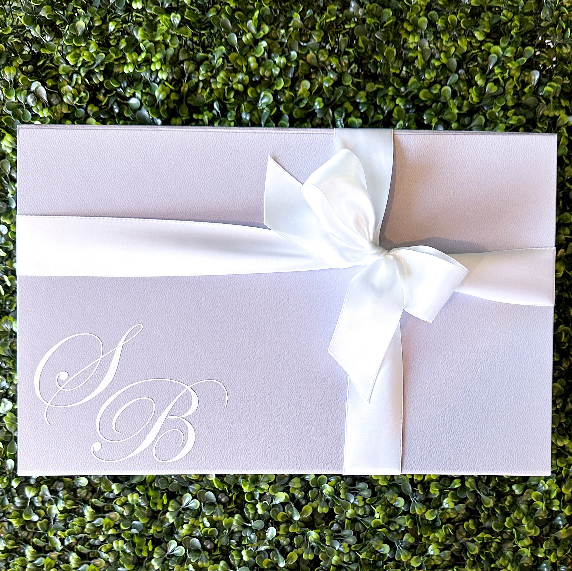 Shown in a lavender box with white personalized name or Initials. Box measures 14" x 9" x 4.3" with a magnetic closure, tied with luxurious satin ribbon, and includes a gift note.