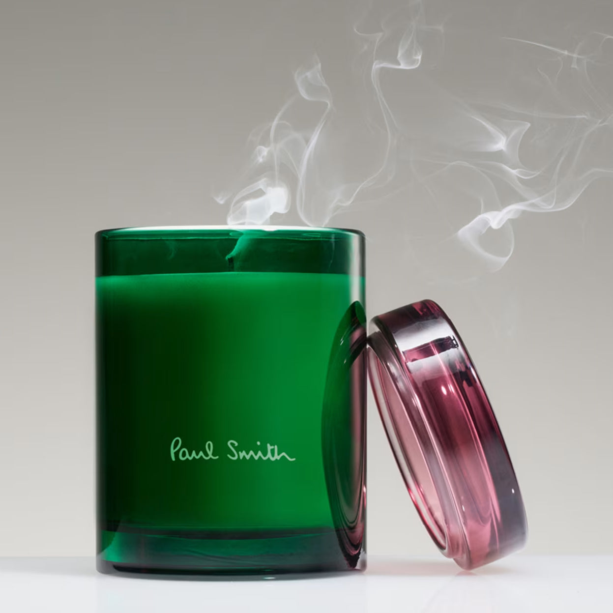 The wax is housed in a tinted glass vessel complete with a contrasting lid that doubles as a coaster. Made in the UK.