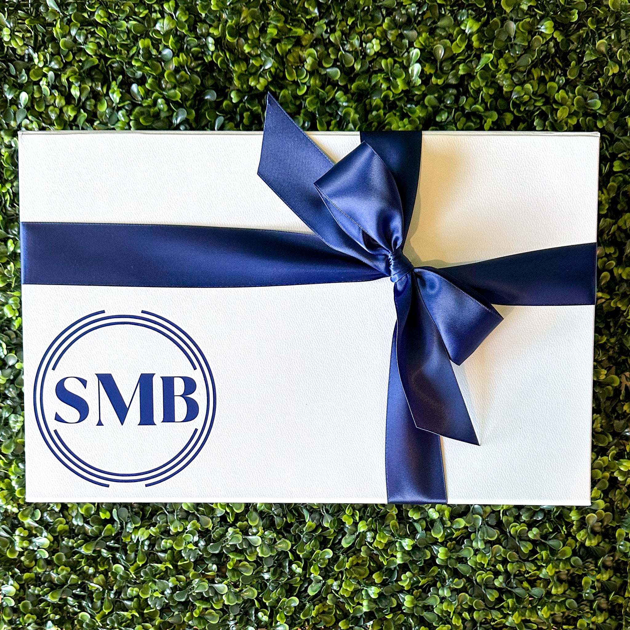 Shown in a white box with navy blue personalized name or Initials. Box measures 14" x 9" x 4.3" with a magnetic closure, tied with luxurious satin ribbon, and includes a gift note.