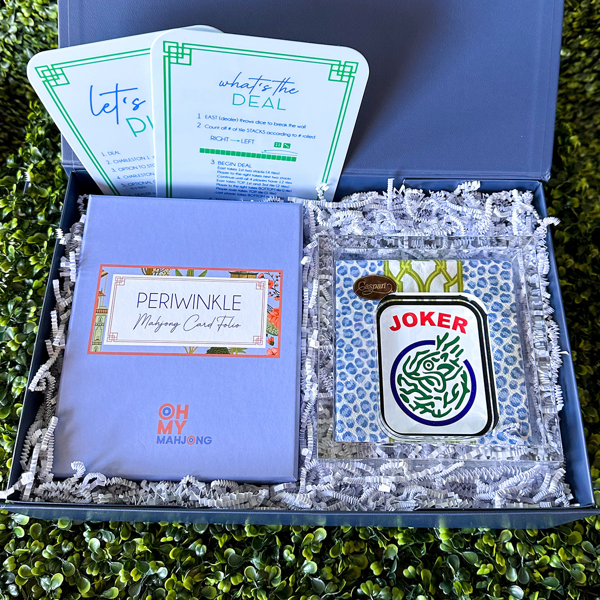 - A clear acrylic cocktail napkin holder, Caspari napkins, and an acrylic Mahjong Joker Tile acts as napkin weight. This gift is a consistent in-store best seller.
