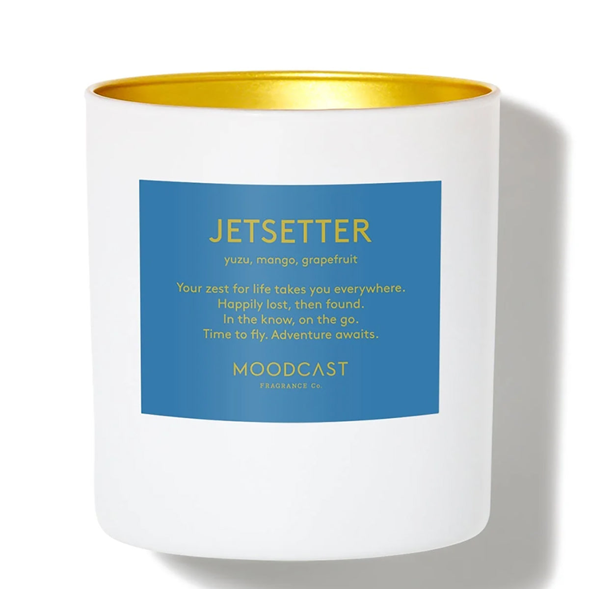 - Moodcast's Jetsetter Candle with scent notes of yuzu, mango, and grapefruit. made in the USA with a clean-burning blend of coconut wax with natural cotton wicks. No parabens, phthalates, or sulfates. Fill: 8oz (227g)