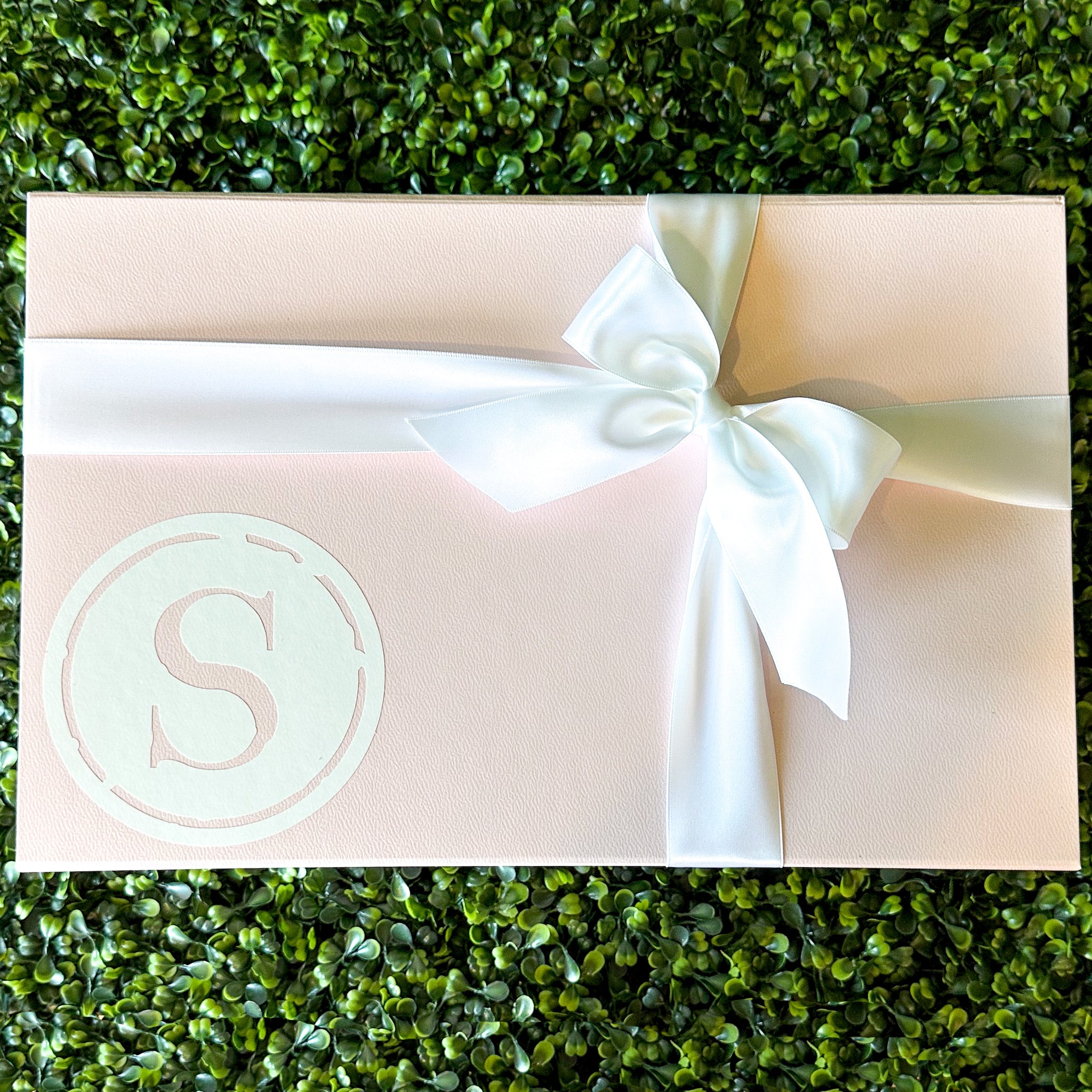 Shown in a pink box with white personalized name or initials. Box measures 14" x 9" x 4.3" with a magnetic closure, tied with luxurious satin ribbon, and includes a gift note.