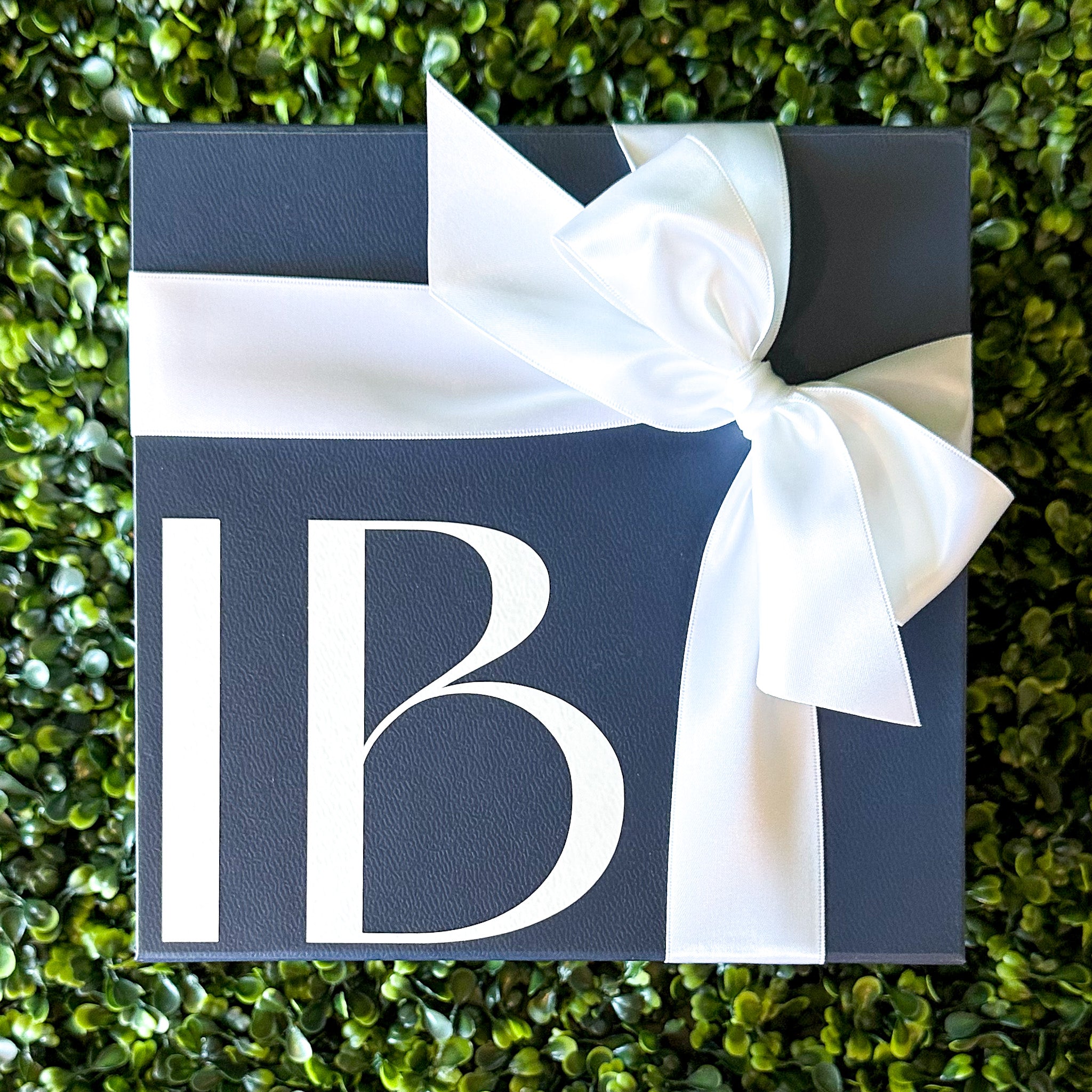 Shown in a navy box with white personalized name or initials. Box measures 8" x 8" x 4" with a magnetic closure, tied with luxurious satin ribbon, and includes a gift note.
