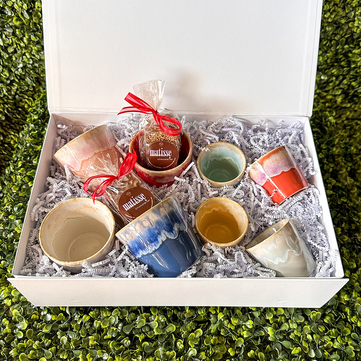 This box set is perfect for coffee lovers. A gift of 4 beautiful stoneware Lungo coffee cups (6.5 oz) and 4 Espresso cups (2 3/8 oz), made in Portugal. We include an assortment of milk and dark chocolates from Matisse Chocolatier, a local treasure. Chocolates include nuts. Cup colors may vary; please call the store for selection or allow us to assort. Oven, microwave, dishwasher and freezer safe.