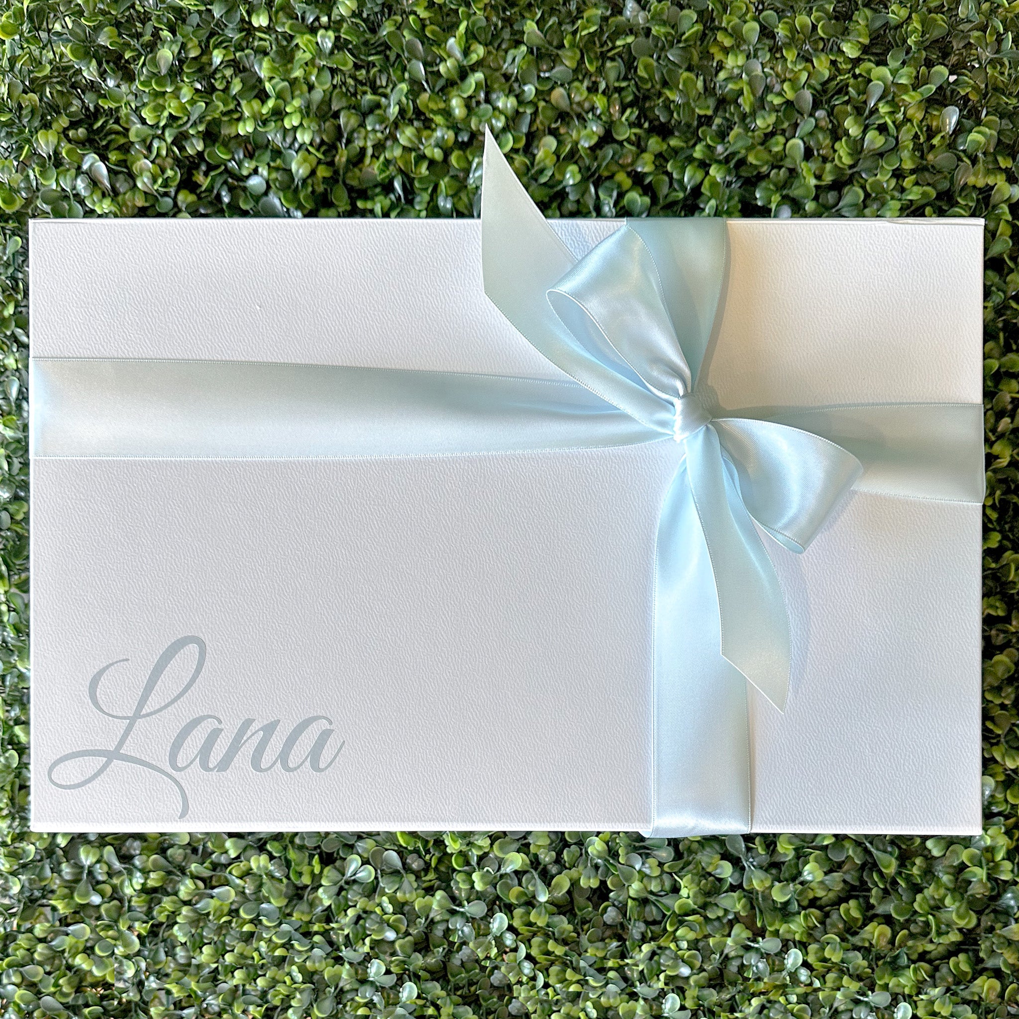 Shown in a white box with pale blue personalized name or Initials. Box measures 14" x 9" x 4.3" with a magnetic closure, tied with luxurious satin ribbon, and includes a gift note.