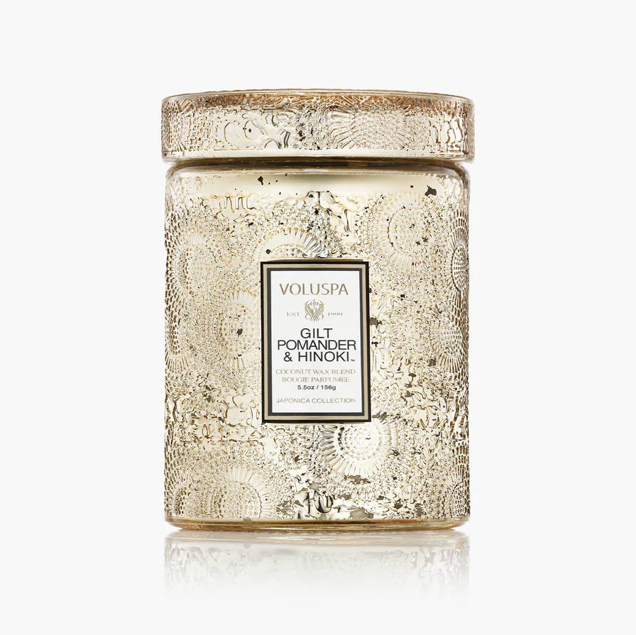- Voluspa's Gilt Pomander & Hinoki Small Jar Candle. This beautiful candle is housed in a 5.5 oz. glass embossed vessel and is topped with a matching lid that keeps the candle dust-free when not in use. The single wick allows you to enjoy fragrance throw for 50 hours. Handcrafted in the US, and features a clean-burning coconut wax blend and natural wicks, free of phthalates, parabens, and sulfates. and are never tested on animals. Scent profile: spiced cardamom, clove-studded citrus pomander, holly berries, calming Japanese cedar wood, golden amber, and vanilla pods.