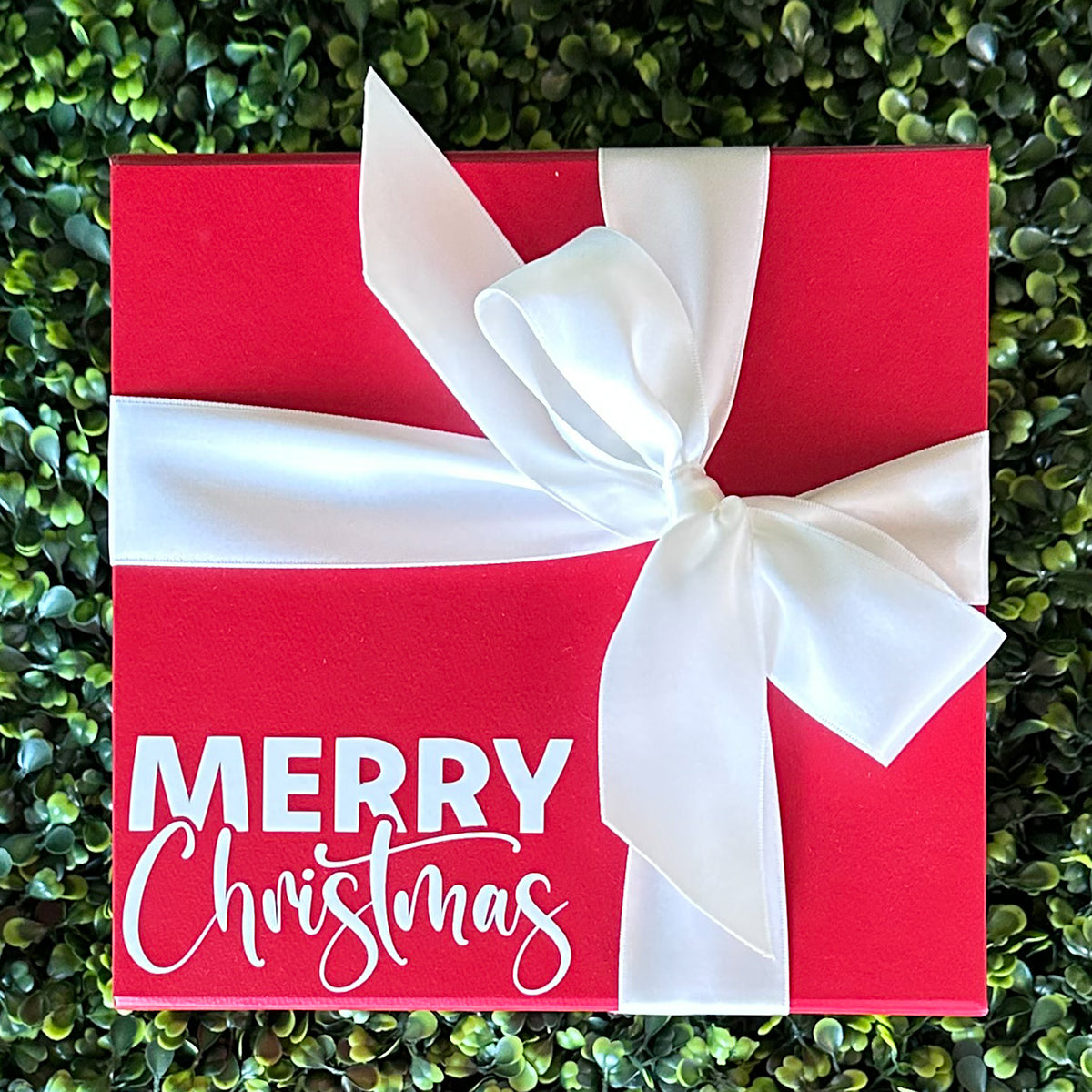 Shown in a red box with white personalized text, or make it your own by choosing from other options. Box measures 8" x 8" x 4" with a magnetic closure, tied with luxurious satin ribbon, and includes a gift note.