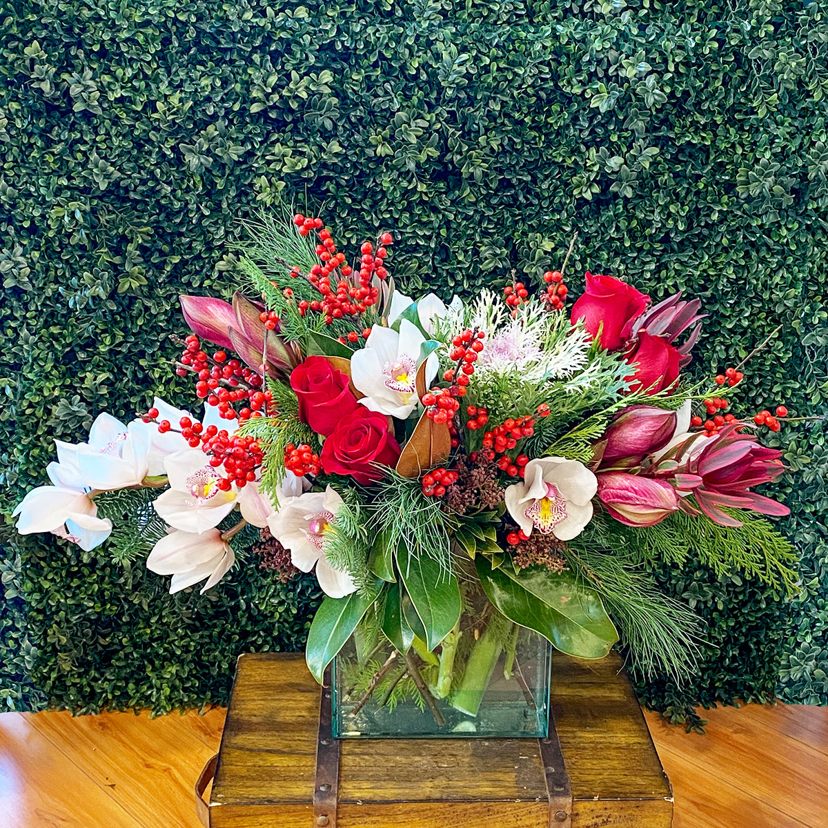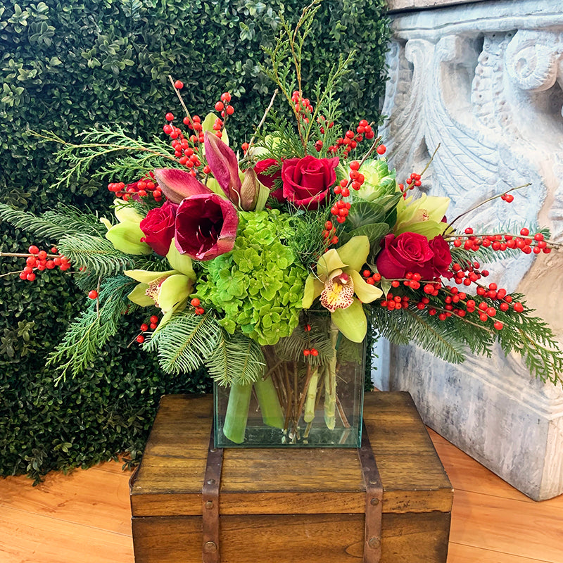 An elegant arrangement of Winter greens and seasonal blooms in the colors of Christmas, all in a rectangular glass vase.