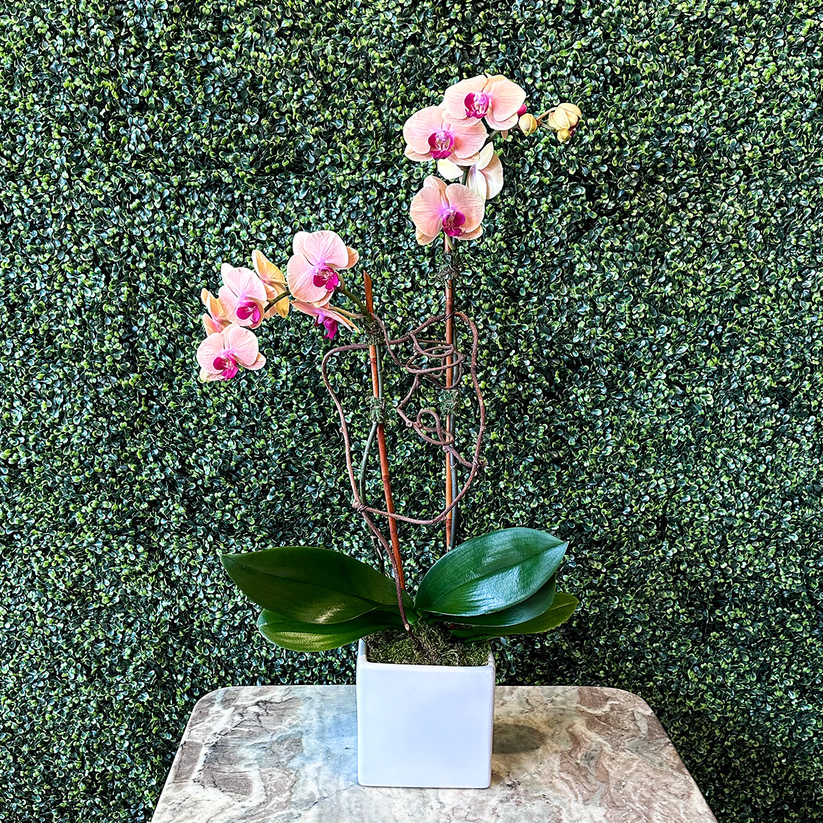 Festive for the season, this peach Phalaenopsis double-stalked plant makes a beautiful gift.